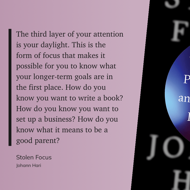 “The third layer of your attention is your daylight. This is the form of focus that makes it possible for you to know what your longer-term goals are in the first place. How do you know you want to write a book? How do you know you want to set up a business? How do you know what it means to be a good parent?” (Johann Hari, Stolen Focus)