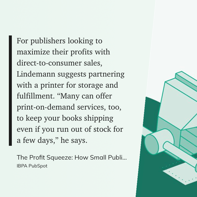 “For publishers looking to maximize their profits with direct-to-consumer sales, Lindemann suggests partnering with a printer for storage and fulfillment. “Many can offer print-on-demand services, too, to keep your books shipping even if you run out of stock for a few days,” he says.” (IBPA PubSpot, The Profit Squeeze: How Small Publishers Are Navigating Tight Margins)