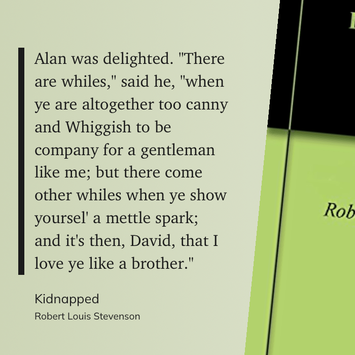 “Alan was delighted. “There are whiles,” said he, “when ye are altogether too canny and Whiggish to be company for a gentleman like me; but there come other whiles when ye show yoursel’ a mettle spark; and it’s then, David, that I love ye like a brother.”” (Robert Louis Stevenson, Kidnapped)
