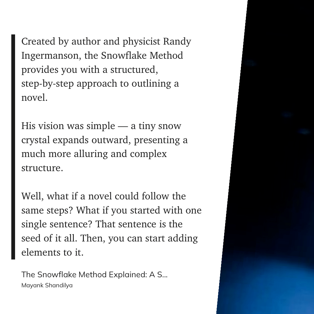 Well, what if a novel could follow the same steps? What if you started with one single sentence? That sentence is the seed of it all. Then, you can start adding elements to it.” (Mayank Shandilya, The Snowflake Method Explained: A Step-by-Step Approach to Outlining Your Story)
