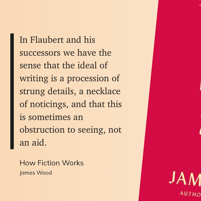 “In Flaubert and his successors we have the sense that the ideal of writing is a procession of strung details, a necklace of noticings, and that this is sometimes an obstruction to seeing, not an aid.” (James Wood, How Fiction Works)
