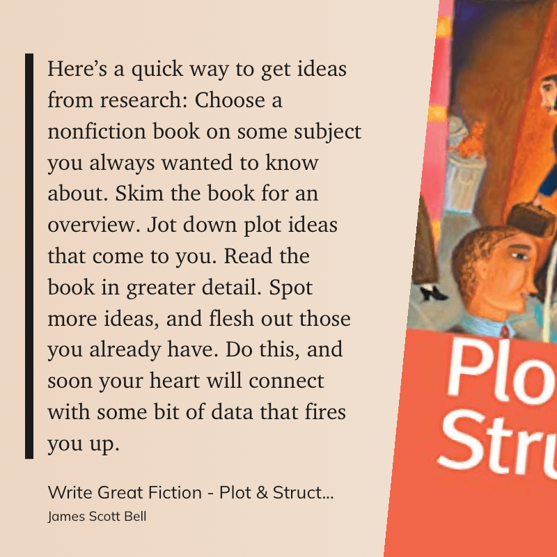“Here’s a quick way to get ideas from research: Choose a nonfiction book on some subject you always wanted to know about. Skim the book for an overview. Jot down plot ideas that come to you. Read the book in greater detail. Spot more ideas, and flesh out those you already have. Do this, and soon your heart will connect with some bit of data that fires you up.” (James Scott Bell, Write Great Fiction – Plot & Structure)