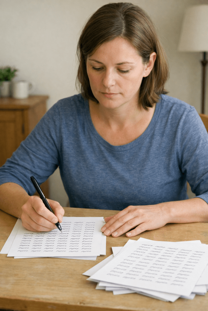 Strong response example: A woman practices signing her name on scrap paper. The first signatures are identical. By the third pass, spacing tightens. The pen lifts more often. Ink pools where it did not before. The final line ends mid-loop as the pen hesitates but does not stop.