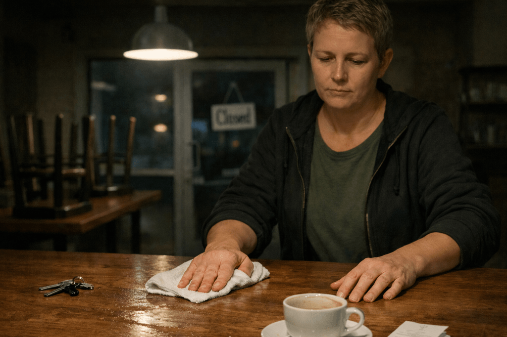 Write a 500-word scene centered on a routine task the character has completed many times before. The task must be ordinary and finite: closing a space, washing something by hand, driving a familiar route, waiting for a transaction to complete.