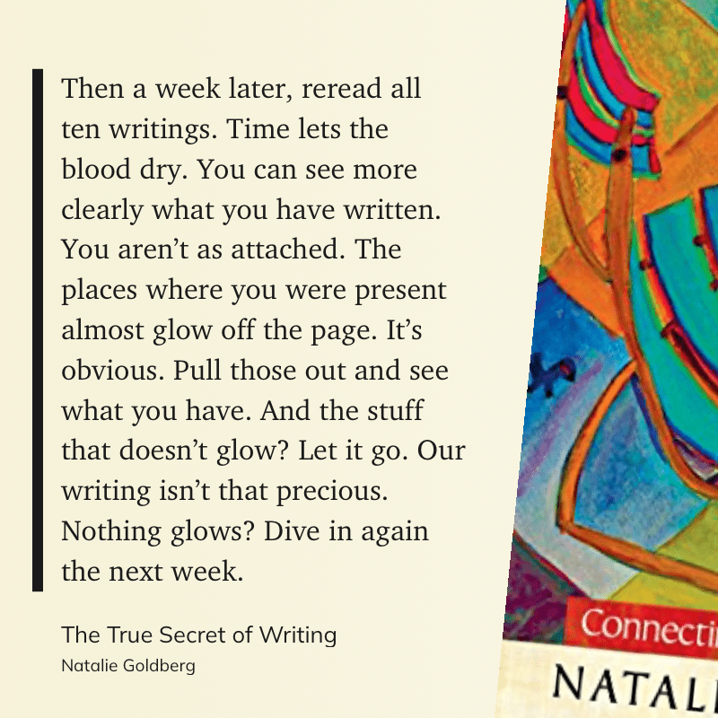 “Then a week later, reread all ten writings. Time lets the blood dry. You can see more clearly what you have written. You aren’t as attached. The places where you were present almost glow off the page. It’s obvious. Pull those out and see what you have. And the stuff that doesn’t glow? Let it go. Our writing isn’t that precious. Nothing glows? Dive in again the next week.” (Natalie Goldberg, The True Secret of Writing)