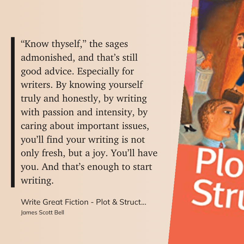 ““Know thyself,” the sages admonished, and that’s still good advice. Especially for writers. By knowing yourself truly and honestly, by writing with passion and intensity, by caring about important issues, you’ll find your writing is not only fresh, but a joy. You’ll have you. And that’s enough to start writing.” (James Scott Bell, Write Great Fiction – Plot & Structure)