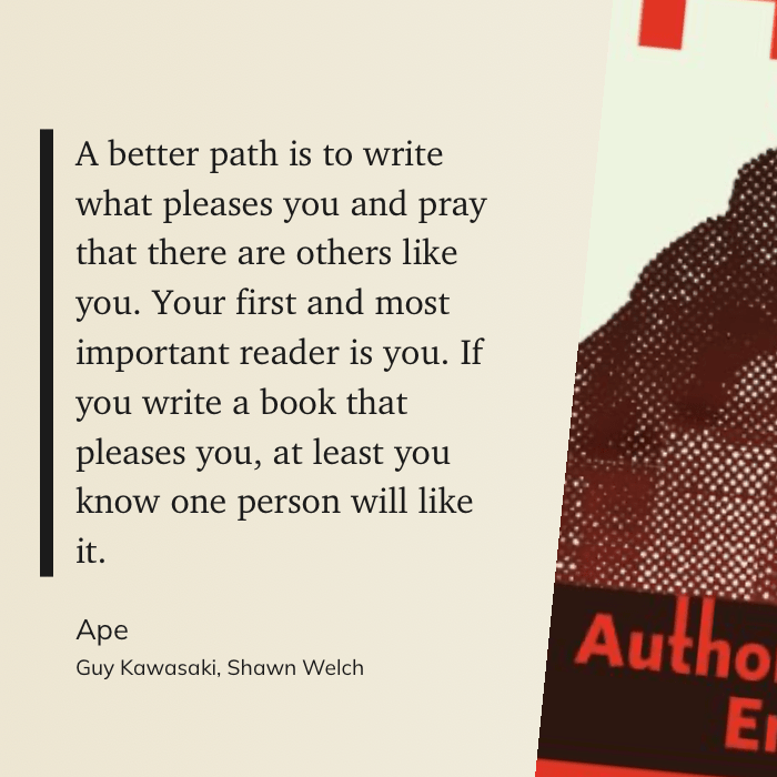 “A better path is to write what pleases you and pray that there are others like you. Your first and most important reader is you. If you write a book that pleases you, at least you know one person will like it.” (Guy Kawasaki, Shawn Welch, Ape)