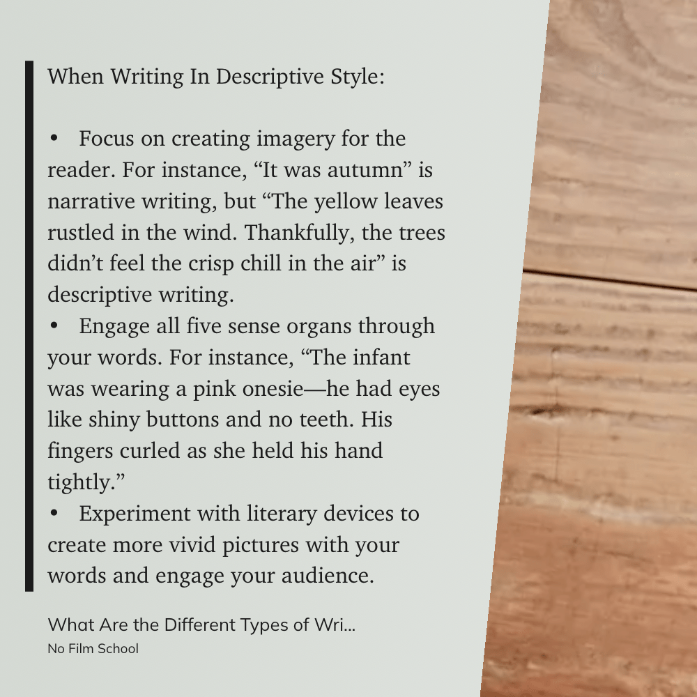 - Experiment with literary devices to create more vivid pictures with your words and engage your audience.” (No Film School, What Are the Different Types of Writing Styles?)