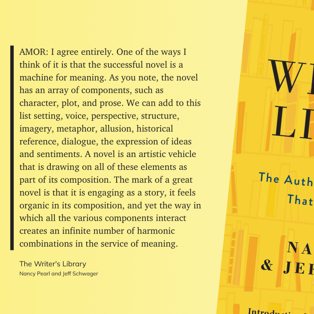 “AMOR: I agree entirely. One of the ways I think of it is that the successful novel is a machine for meaning. As you note, the novel has an array of components, such as character, plot, and prose. We can add to this list setting, voice, perspective, structure, imagery, metaphor, allusion, historical reference, dialogue, the expression of ideas and sentiments. A novel is an artistic vehicle that is drawing on all of these elements as part of its composition. The mark of a great novel is that it is engaging as a story, it feels organic in its composition, and yet the way in which all the various components interact creates an infinite number of harmonic combinations in the service of meaning.” (Nancy Pearl and Jeff Schwager, The Writer’s Library)