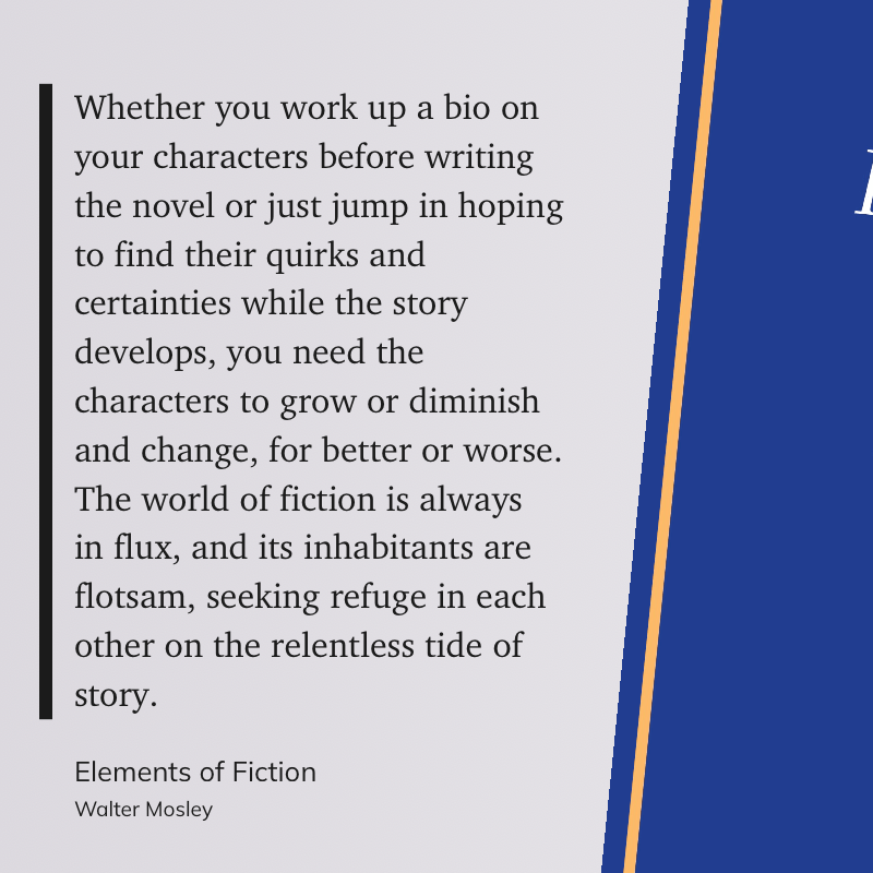 “Whether you work up a bio on your characters before writing the novel or just jump in hoping to find their quirks and certainties while the story develops, you need the characters to grow or diminish and change, for better or worse. The world of fiction is always in flux, and its inhabitants are flotsam, seeking refuge in each other on the relentless tide of story.” (Walter Mosley, Elements of Fiction)