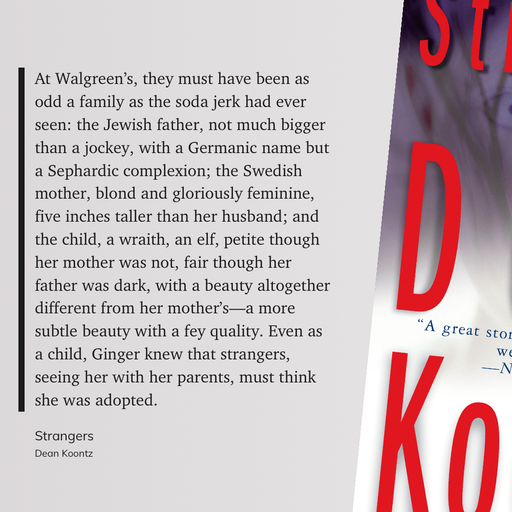 “At Walgreen’s, they must have been as odd a family as the soda jerk had ever seen: the Jewish father, not much bigger than a jockey, with a Germanic name but a Sephardic complexion; the Swedish mother, blond and gloriously feminine, five inches taller than her husband; and the child, a wraith, an elf, petite though her mother was not, fair though her father was dark, with a beauty altogether different from her mother’s—a more subtle beauty with a fey quality. Even as a child, Ginger knew that strangers, seeing her with her parents, must think she was adopted.” (Dean Koontz, Strangers)