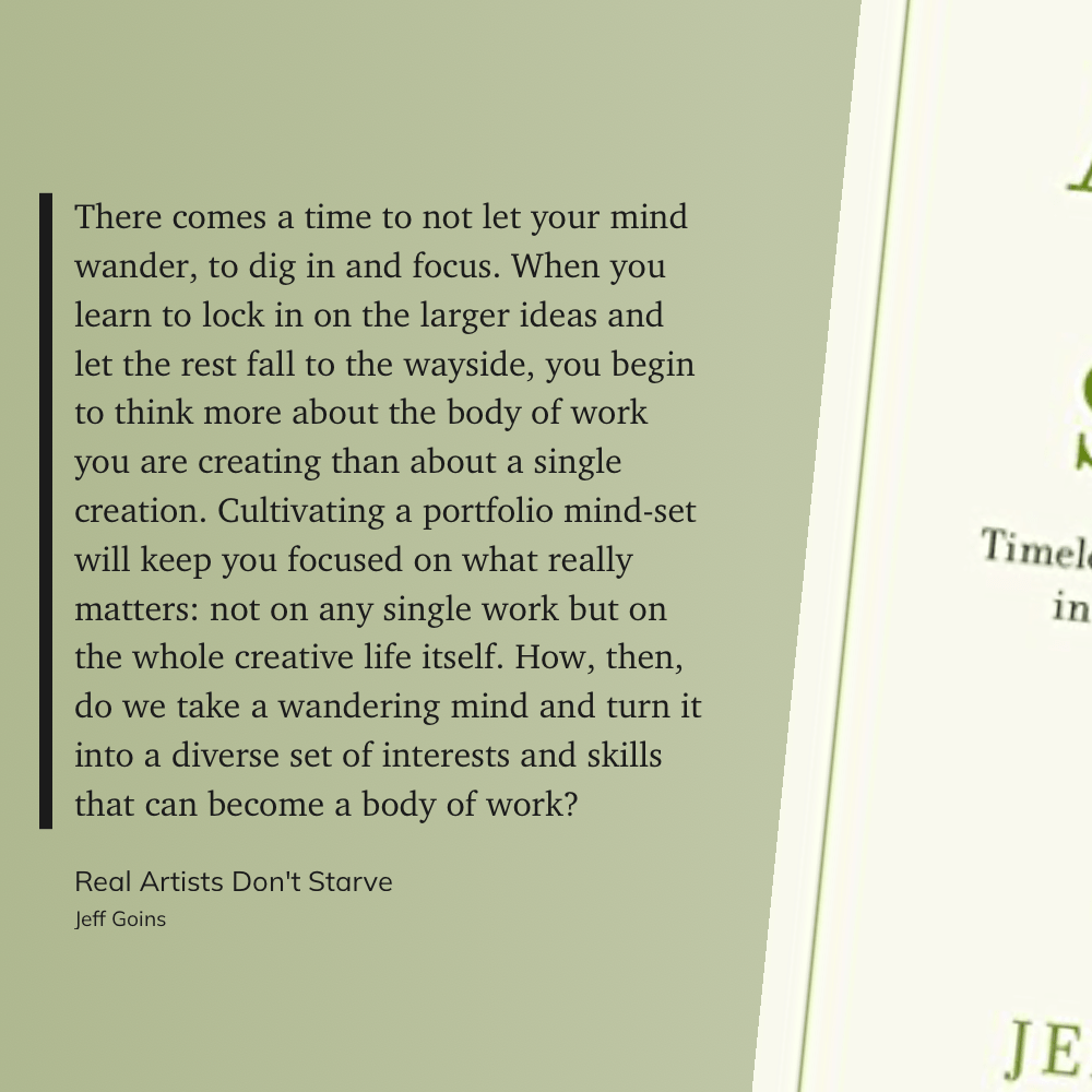 “There comes a time to not let your mind wander, to dig in and focus. When you learn to lock in on the larger ideas and let the rest fall to the wayside, you begin to think more about the body of work you are creating than about a single creation. Cultivating a portfolio mind-set will keep you focused on what really matters: not on any single work but on the whole creative life itself. How, then, do we take a wandering mind and turn it into a diverse set of interests and skills that can become a body of work?” (Jeff Goins, Real Artists Don’t Starve)