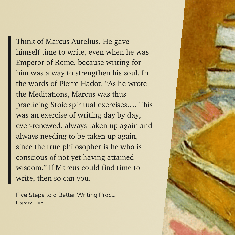 “Think of Marcus Aurelius. He gave himself time to write, even when he was Emperor of Rome, because writing for him was a way to strengthen his soul. In the words of Pierre Hadot, “As he wrote the Meditations, Marcus was thus practicing Stoic spiritual exercises…. This was an exercise of writing day by day, ever-renewed, always taken up again and always needing to be taken up again, since the true philosopher is he who is conscious of not yet having attained wisdom.” If Marcus could find time to write, then so can you.” (Literary Hub, Five Steps to a Better Writing Process)