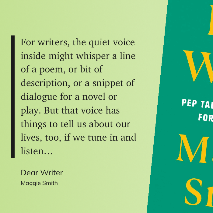 “For writers, the quiet voice inside might whisper a line of a poem, or bit of description, or a snippet of dialogue for a novel or play. But that voice has things to tell us about our lives, too, if we tune in and listen…” (Maggie Smith, Dear Writer)