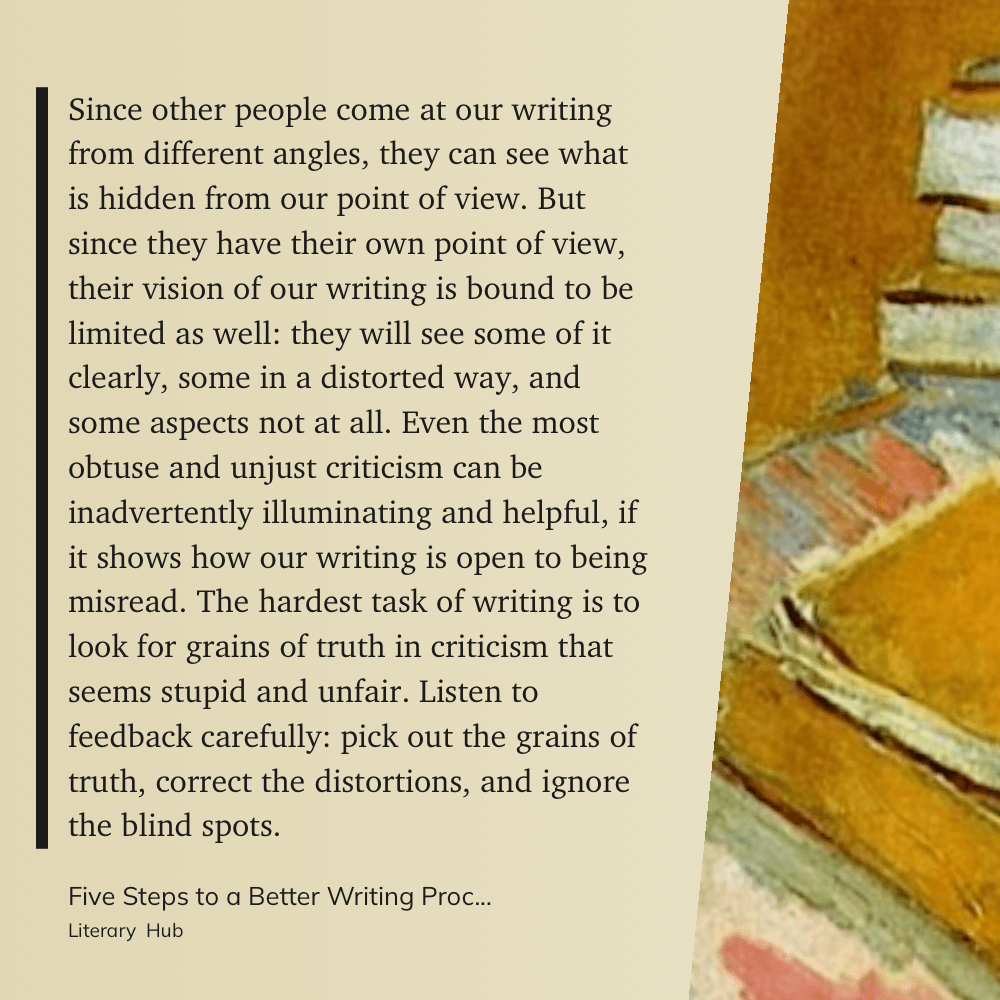 “Since other people come at our writing from different angles, they can see what is hidden from our point of view. But since they have their own point of view, their vision of our writing is bound to be limited as well: they will see some of it clearly, some in a distorted way, and some aspects not at all. Even the most obtuse and unjust criticism can be inadvertently illuminating and helpful, if it shows how our writing is open to being misread. The hardest task of writing is to look for grains of truth in criticism that seems stupid and unfair. Listen to feedback carefully: pick out the grains of truth, correct the distortions, and ignore the blind spots.” (Literary Hub, Five Steps to a Better Writing Process)