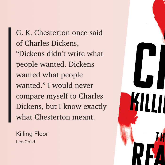 “G. K. Chesterton once said of Charles Dickens, “Dickens didn’t write what people wanted. Dickens wanted what people wanted.” I would never compare myself to Charles Dickens, but I know exactly what Chesterton meant.” (Lee Child, Killing Floor)