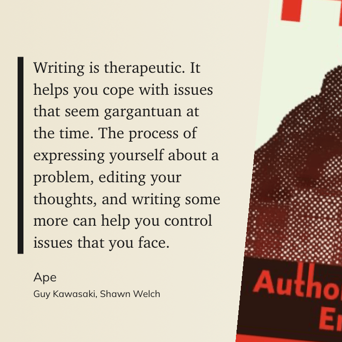 “Writing is therapeutic. It helps you cope with issues that seem gargantuan at the time. The process of expressing yourself about a problem, editing your thoughts, and writing some more can help you control issues that you face.” (Guy Kawasaki, Shawn Welch, Ape)