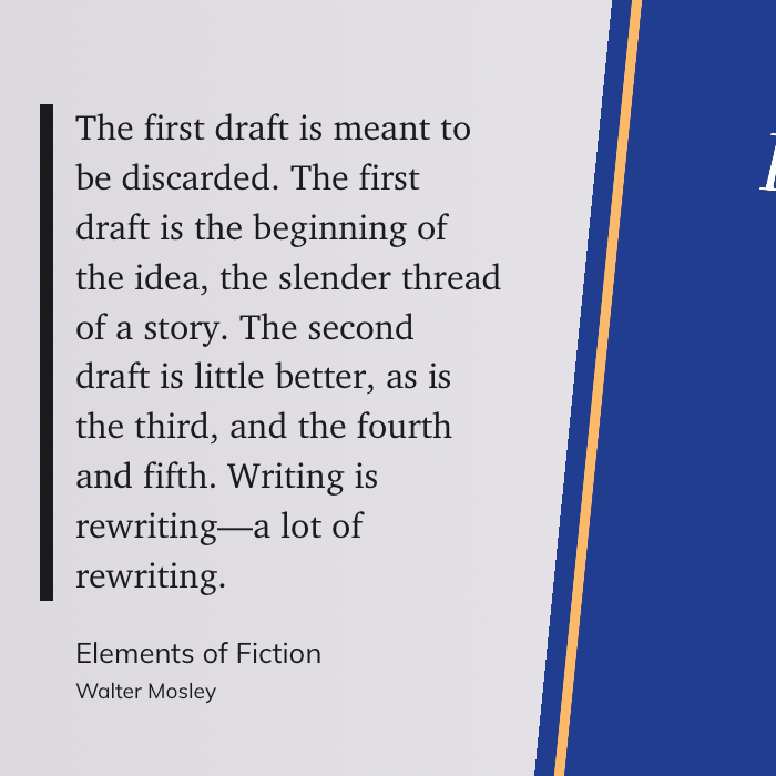 “The first draft is meant to be discarded. The first draft is the beginning of the idea, the slender thread of a story. The second draft is little better, as is the third, and the fourth and fifth. Writing is rewriting—a lot of rewriting.” (Walter Mosley, Elements of Fiction)