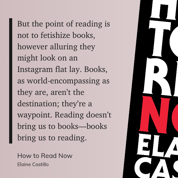 “But the point of reading is not to fetishize books, however alluring they might look on an Instagram flat lay. Books, as world-encompassing as they are, aren’t the destination; they’re a waypoint. Reading doesn’t bring us to books—books bring us to reading.” (Elaine Castillo, How to Read Now)