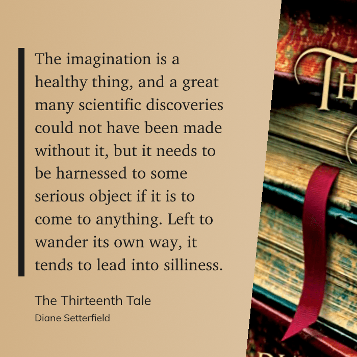 “The imagination is a healthy thing, and a great many scientific discoveries could not have been made without it, but it needs to be harnessed to some serious object if it is to come to anything. Left to wander its own way, it tends to lead into silliness.” (Diane Setterfield, The Thirteenth Tale)