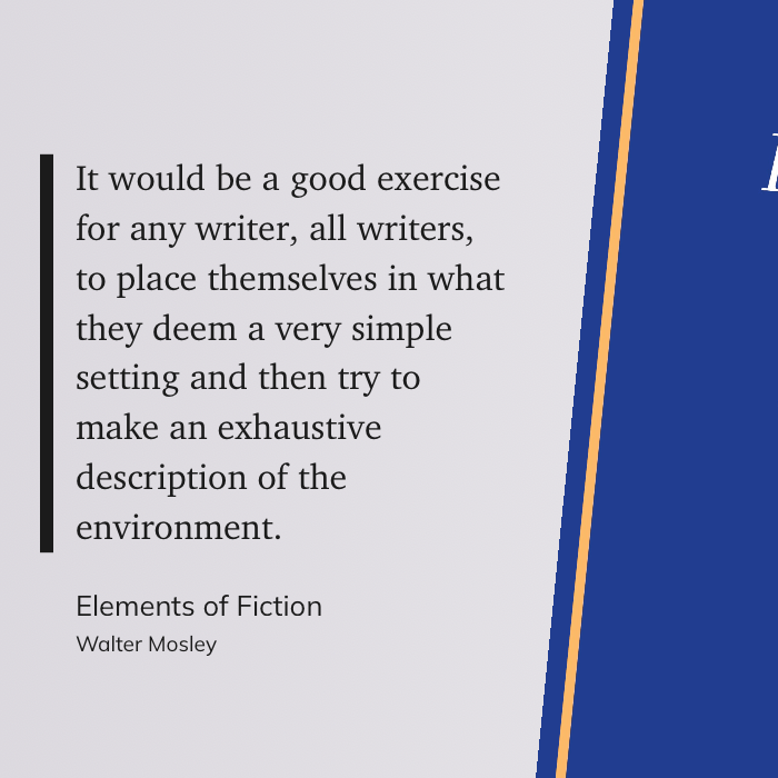 “It would be a good exercise for any writer, all writers, to place themselves in what they deem a very simple setting and then try to make an exhaustive description of the environment.” (Walter Mosley, Elements of Fiction)