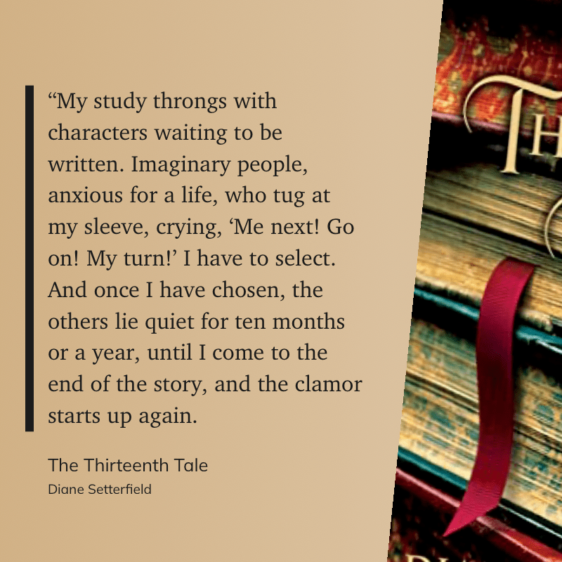 ““My study throngs with characters waiting to be written. Imaginary people, anxious for a life, who tug at my sleeve, crying, ‘Me next! Go on! My turn!’ I have to select. And once I have chosen, the others lie quiet for ten months or a year, until I come to the end of the story, and the clamor starts up again.” (Diane Setterfield, The Thirteenth Tale)