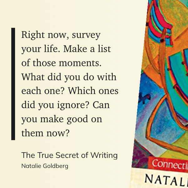 “Right now, survey your life. Make a list of those moments. What did you do with each one? Which ones did you ignore? Can you make good on them now?” (Natalie Goldberg, The True Secret of Writing)