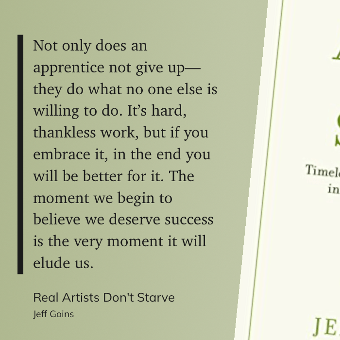 “Not only does an apprentice not give up—they do what no one else is willing to do. It’s hard, thankless work, but if you embrace it, in the end you will be better for it. The moment we begin to believe we deserve success is the very moment it will elude us.” (Jeff Goins, Real Artists Don’t Starve)